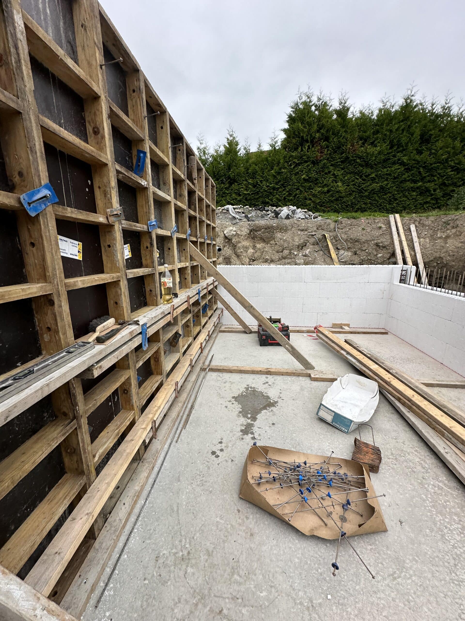 Sprenging, utgraving, støp av gulv/vegger og etg. skille, tilbygg på Langhus.